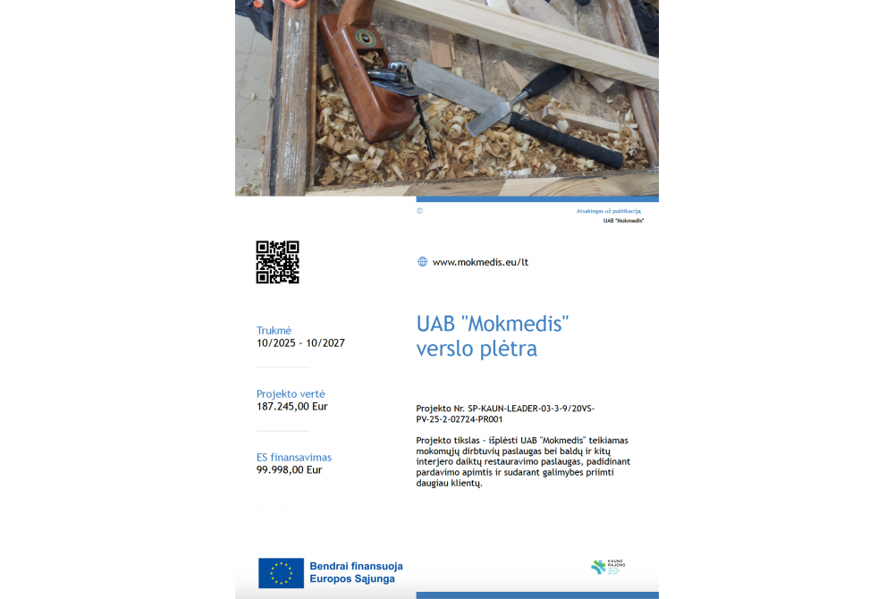 UAB „Mokmedis“ įgyvendina projektą „UAB „Mokmedis“ Verslo plėtra“. Projektas įgyvendinamas VPS priemonės rūšies „Nežemės ūkio verslo kūrimas ir plėtra“ priemonę Nr. KAUN-LEADER-20VVG-03-01 „Ne žemės ūkio verslo kūrimas ir plėtra užtikrinant klimato pokyčiams neutralius veiksmus“.